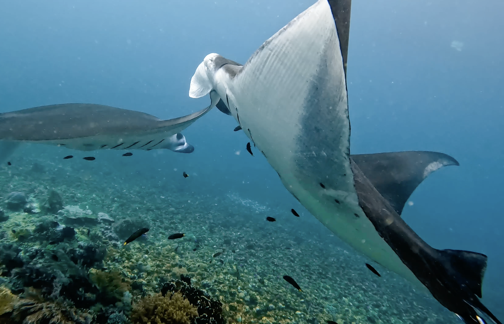 Hacia mucho tiempo que no tenia una jornada de viaje tan llena de estímulos, pero aún quedaba mucho día por delante y el parque tenia una gran sorpresa reservada para nosotros. Tras comer en la preciosa Pink Beach, nos fuimos a Manta Point, un lugar en mitad del archipiélago donde en su fondo marino es común encontrarse con manta rayas, ya que es aquí donde vienen a desparasitarse en los arrecifes gracias a los pequeños peces «limpiadores». Durante una hora, estuve buceando y «bailando» con ellas en completa soledad, mientras ponía en práctica mis habilidades de apnea. Son unos animales increíblemente bellos e hipnóticos, podrías estar horas contemplando sus delicados movimientos bajo el agua y no habrías desperdiciado ni un solo segundo.