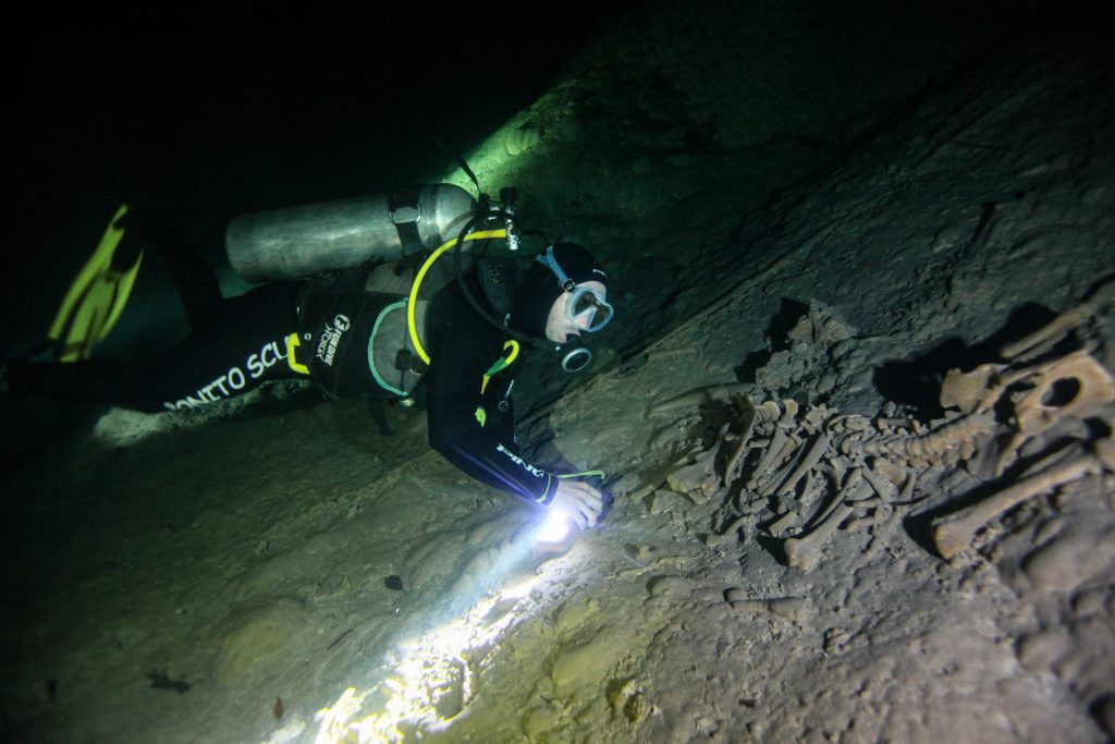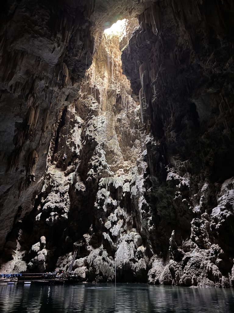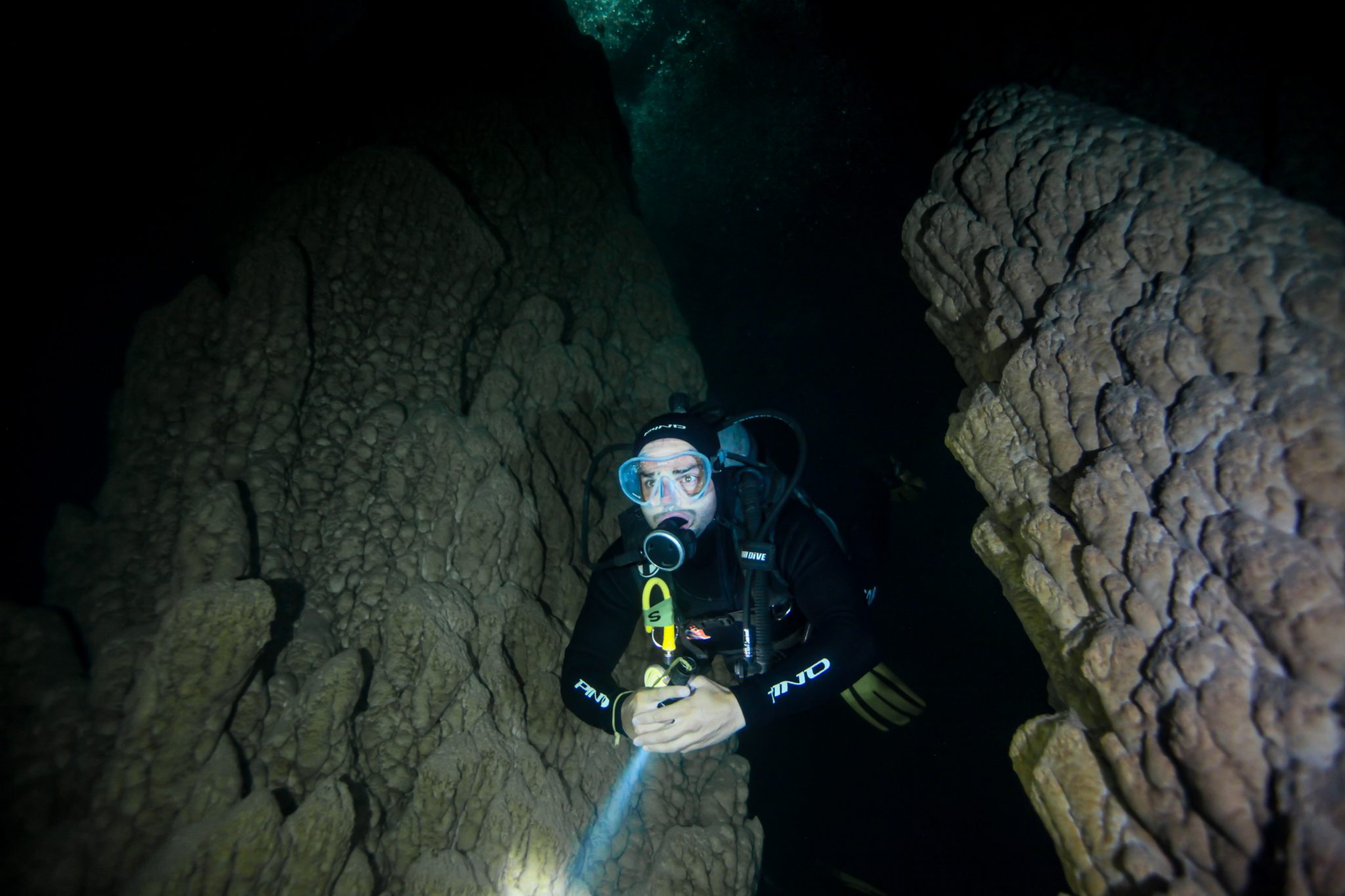 El día previo a la actividad me acerqué a la oficina para mostrar mi permiso de buceo y firmar algunos documentos de responsabilidad, de modo que, al día siguiente, fui directo a la acción. Una vez en el lugar, y tras una breve charla de seguridad, descendí rapelando unos 60 metros mediante un sistema de poleas electrónicas hasta una plataforma flotante en el fondo de la caverna. Solo por las vistas de los rayos de sol entrando por la estrecha abertura del techo, iluminando decenas de metros de profundidad bajo la superficie del agua, ya mereció la pena la actividad.