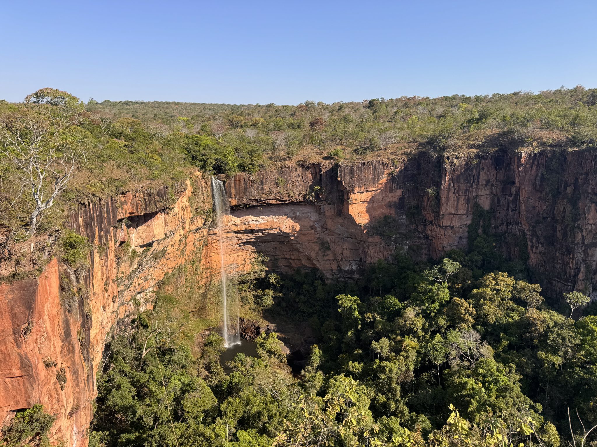 Tras dejar mi mochila en el nuevo alojamiento y comer algo en la plaza principal de este encantador pueblo, aprovecho para hacer una de las pocas excursiones que se pueden realizar por libre en el Parque Nacional Chapada dos Guimarães: el sendero que conduce a la cascada Véu de Noiva. Es un recorrido bastante corto, de menos de un kilómetro, que permite llegar a uno de los rincones más emblemáticos de esta zona. Aunque el caudal de la cascada no es muy abundante, las paredes rojizas que la rodean aportan al paisaje una gran belleza.