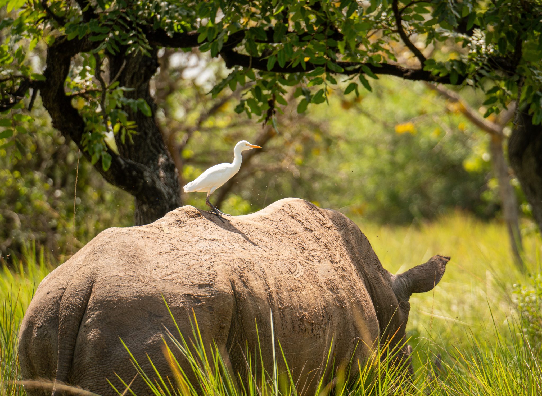 Una garza montando sobre un rinoceronte blanco en Ziwa.