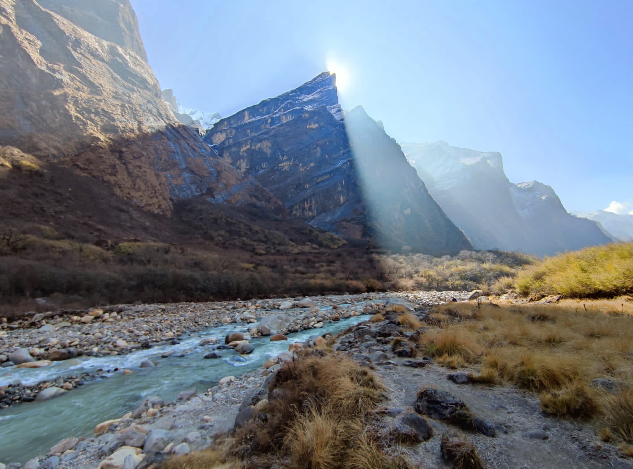 Último amanecer y madrugón en el Parque Nacional de los Annapurnas. Descendemos de nuevo al río para volver a subir las infinitas escaleras de Chomrong hasta el check point ACA. Tras sellarnos los permisos, continuamos subiendo hasta llegar a lo alto del pueblo, arriba giramos a la izquierda dirección Jhinu, si giras a la derecha volverías a Ghandruk. Cambiamos de valle y seguimos bajando, subiendo, bajando y volviendo a subir hasta llegar a las aguas termales de Jhinu. El recinto consta de dos piscinas, una de agua templada y otra de agua caliente, pero como nosotros somos así de «especiales», decidimos meternos en el agua gélida de los glaciares del Annapurna, para después «disfrutar más» del agua caliente.