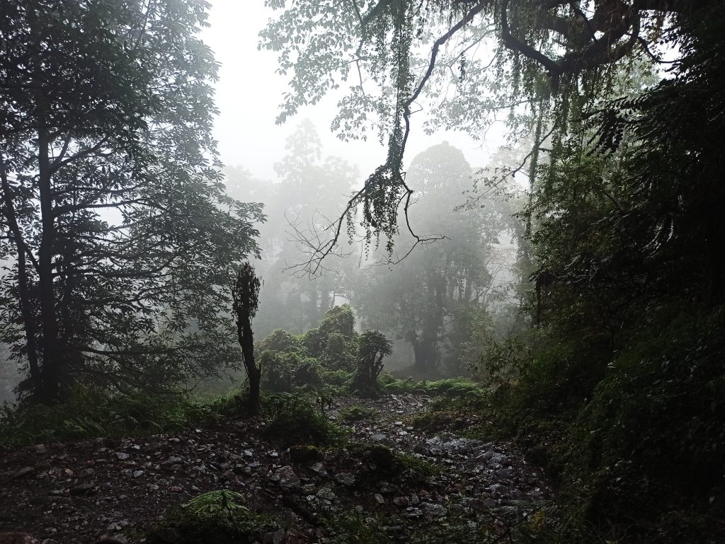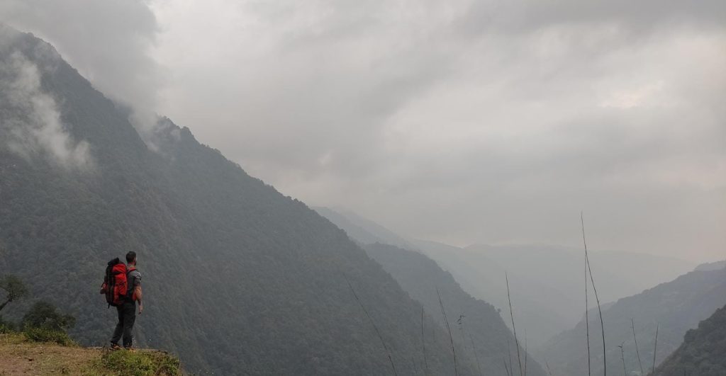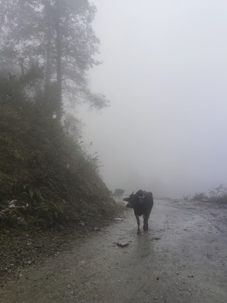 La lluvia chocando contra el techo de metal de la habitación hace que nos despertemos temiéndonos lo peor, va a tocar una etapa pasada por agua. El día es horrible meteorológicamente hablando, porque visualmente es una auténtica pasada. Salir de Ghandruk no fue fácil, nos llevó un bueno rato hasta que comenzamos la ruta dirección Komrong Danda (2100m). Tardamos en llegar 1h30′ a nuestra primera parada. Tras tomarnos un café, reponer fuerzas y entrar un poco en calor, nos preparamos para la parte dura del día, tenemos que bajar de nuevo hasta el valle, cruzar el rio y volver a subir la ladera contraria hasta los 2100m.