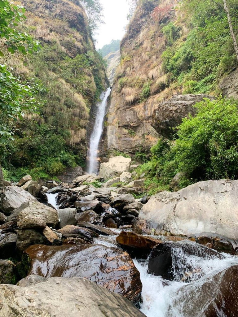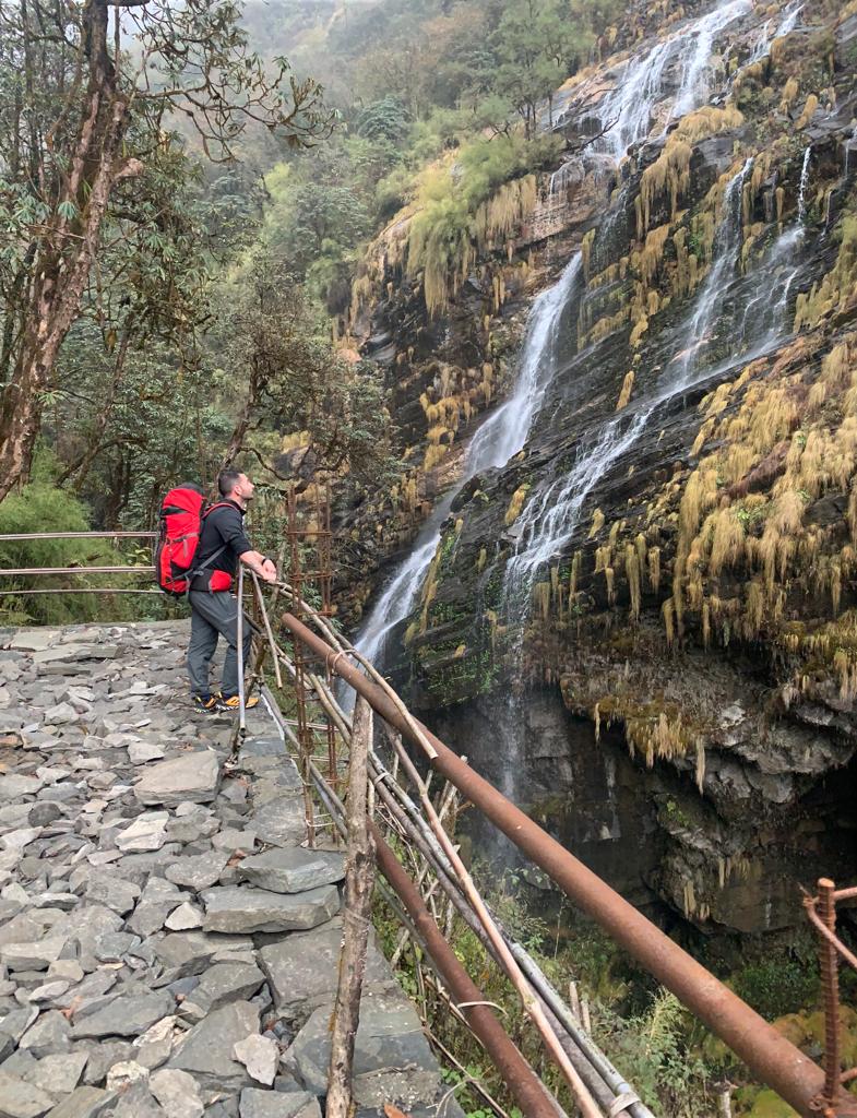 La subida es dura y preciosa a la par, cuando descansas y miras atrás, puedes ver la profundidad del valle, la gente local trabajando en sus plantaciones, casas aisladas en la ladera, resumiendo… un lujo para todos los sentidos. Retomamos el camino, ahora llano, y seguimos andando. Paramos a ver una cascada, sacar unas fotos y tomar un café. La ruta está muy bien señalizada, pero en caso de duda siempre había alguna persona en el lugar más inesperado encantada de ayudarnos. Llegamos a Ghandruk (2030m altitud) a las 5h de nuestro inicio, paradas incluidas, habiendo recorrido 14km – 960m+.
