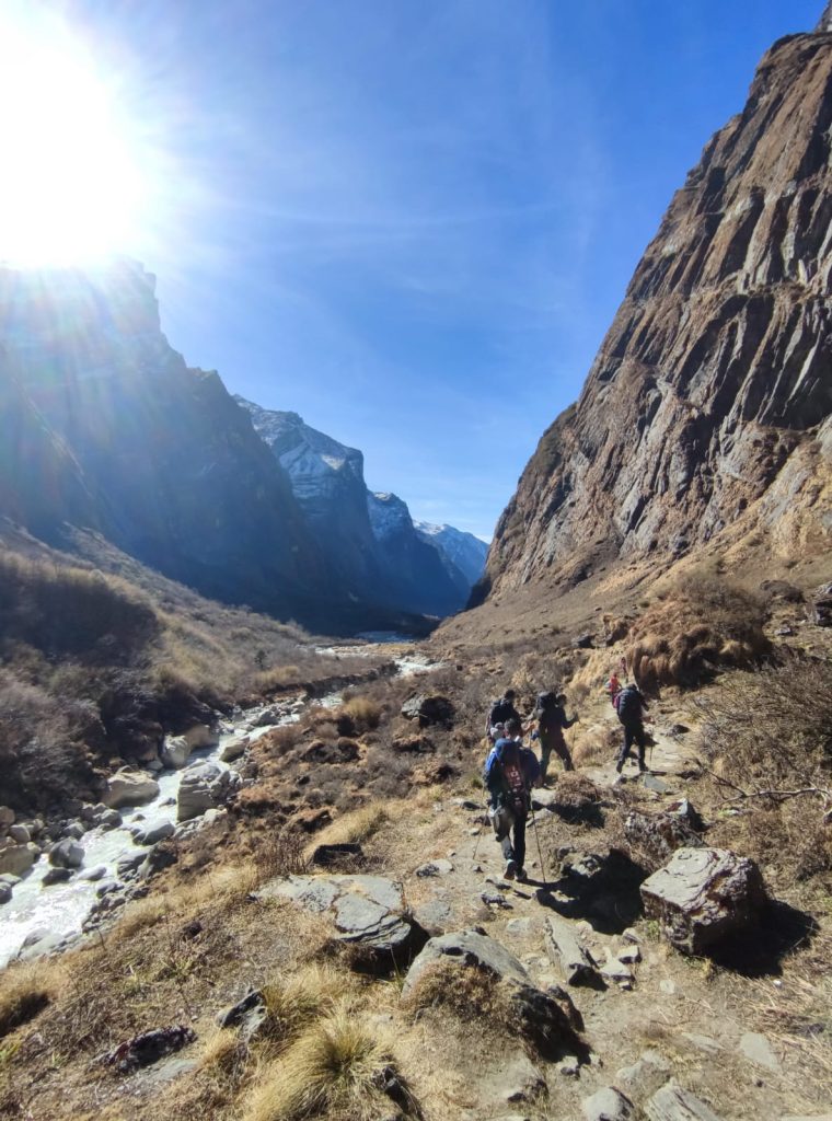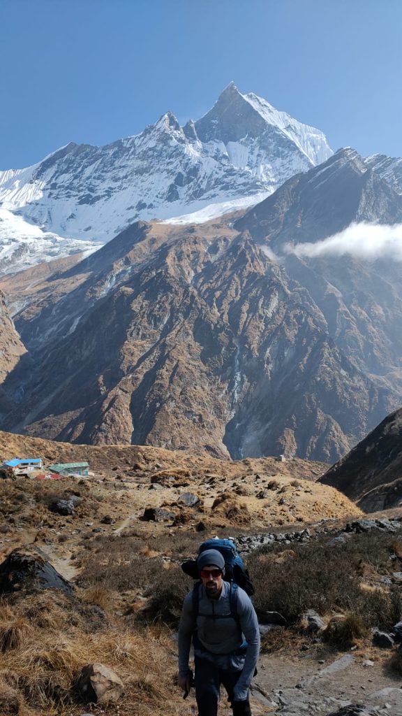 Aunque la altitud comienza hacer mella, no bajamos el ritmo. En cada kilómetro que avanzamos aparecen en escena nuevos picos cada vez más altos, uno de ellos, el famoso Machapunchare 6993m, la Montaña Intacta, sagrada para la población local cuya escalada no esta permitida, en nepalí significa «cola de pez». Personalmente fue la montaña que más me impresionó, su forma de pirámide me recordaba al K2, como si de su hermana pequeña se tratara. Tras tomar un café, nos lanzamos al último tramo de la etapa, dirección campo base del Annapurna. Mientras ascendíamos dejábamos atrás el Machapunchare, cuyas vistas cada vez eran más espectaculares.