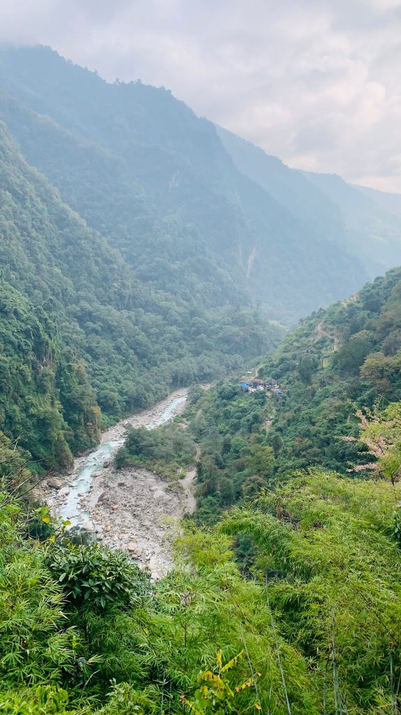 Tras descansar y tomar un café, volvemos a la senda dirección Landruk, el final de nuestro trekking. El entorno cada vez se vuelve más selvático, la vegetación se come el terreno y el terreno al camino. Es la primera vez en todo el trekking que nos cuesta ubicarnos, y en medio de todas las dudas aparece una «Y», a la izquierda cruzas el río y vas a la ladera opuesta del valle en el que nos encontramos y a la derecha comienzas a subir por la ladera de nuestro lado. Finalmente, nos decantamos por la derecha y mantenernos en nuestra ladera, al cabo de 1h30′ andando por un camino inexistente, jugándonos la vida absurdamente, nos dimos cuenta de que Landruk estaba en frente nuestra, a una altitud muy superior a donde nos encontramos. El desánimo se apoderó de nosotros, tuvimos que desandar lo andando y volver a la «Y» para coger el camino correcto.
