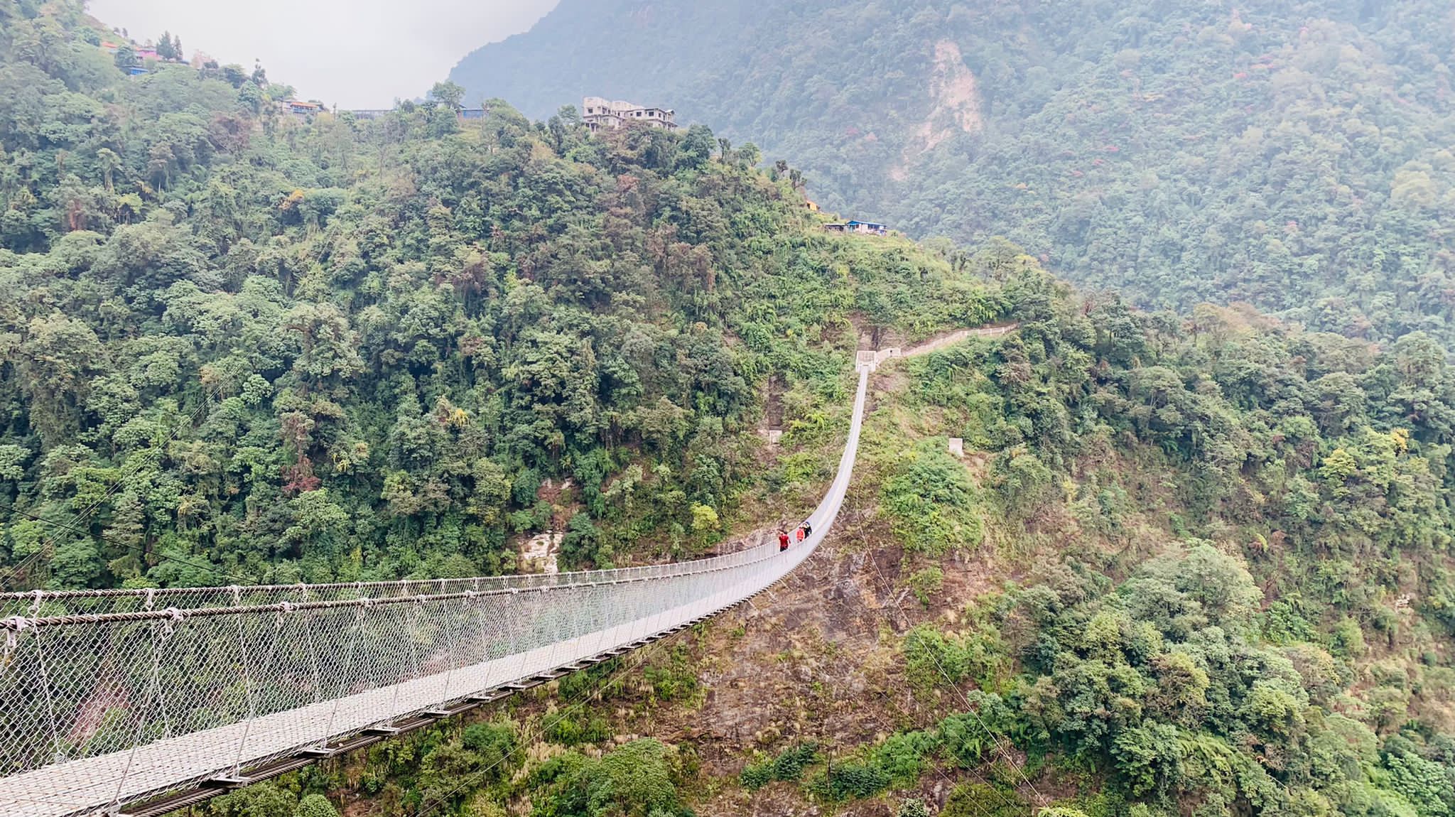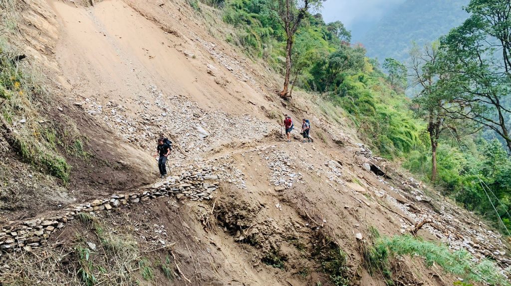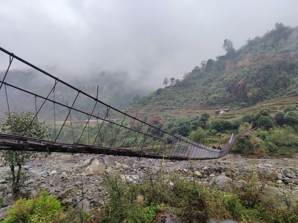 Con las piernas como nuevas, continuamos con la ruta. A lo largo del camino, pudimos ver como antiguos deslizamientos del terreno se han comido parte de él, teniendo que pasar por encima de arenas y piedras «movedizas». Justo antes de llegar a New Bridge, cruzamos un clásico puente nepalí de unos 300m, el más largo de este recorrido.