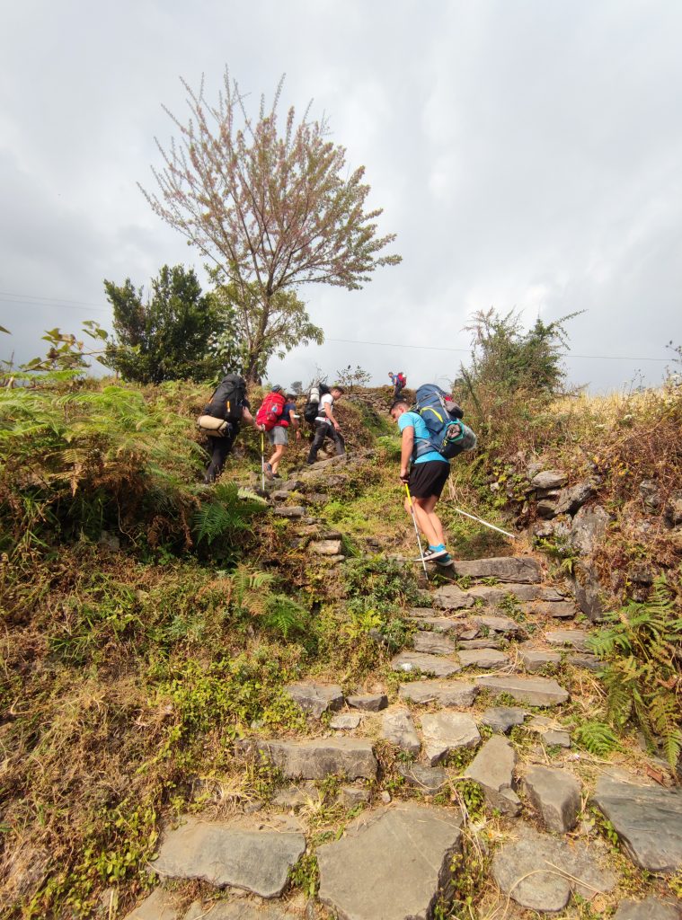 Bordeamos el pueblo durante 1km, hasta llegar al puente de Birethanti, lugar donde tienes que presentar los permisos ACA. Aquí se bifurca el camino: izquierda Poon Hill y derecha Grandruk, el nuestro. Los próximos 5km (1h15′) transcurren por una carretera semiasfaltada hasta llegar a una indicación donde pone: GHANDRUK 3H. A partir de este punto comienza lo duro de la etapa, escaleras, escalera y más escaleras, 1h literalmente subiendo hasta que llegas al camino principal.