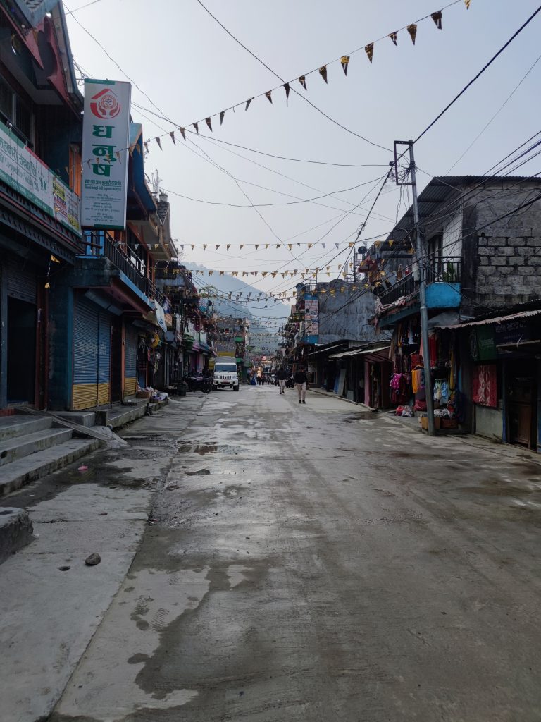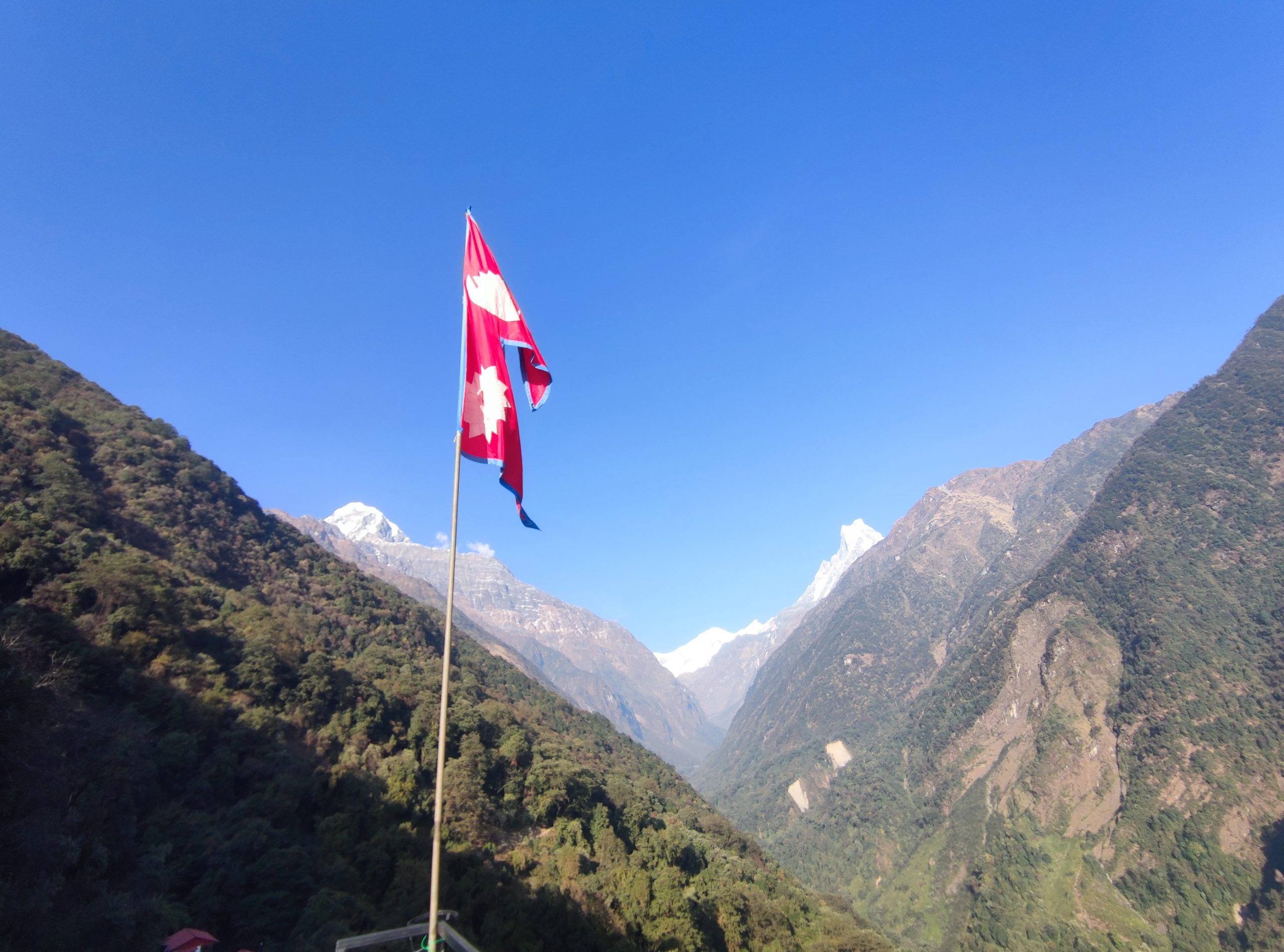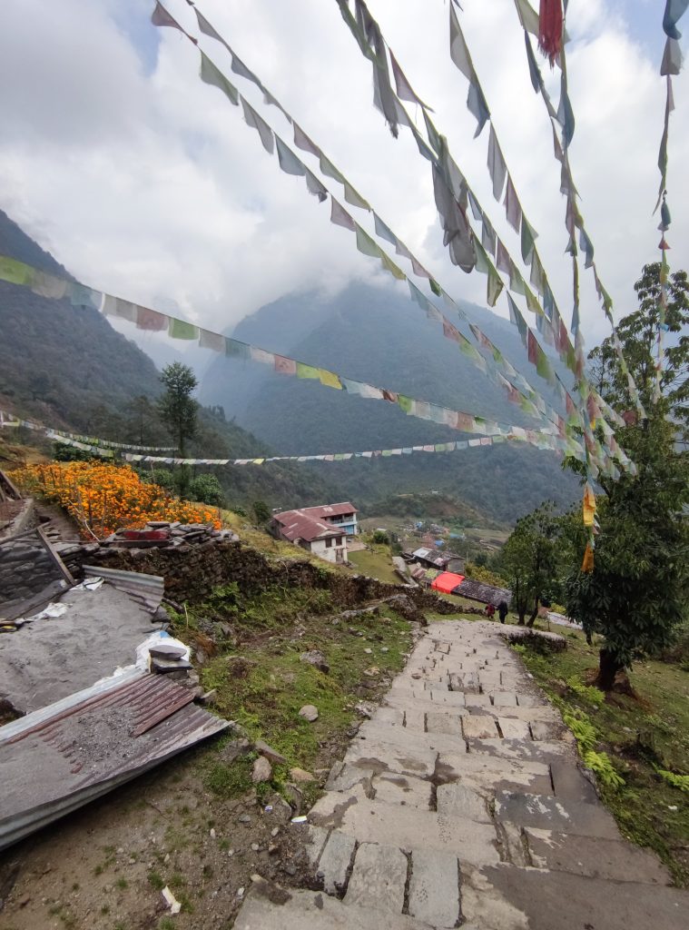 Tras la gélida noche, el día amanece mucho más despejado. Los picos más altos del valle siguen escondidos por las nubes, se están haciendo de rogar. Seguimos la dinámica de los días anteriores, tenemos que volver a bajar hasta fondo de un nuevo valle, cruzar el río y volver a subir. Mientras bajamos las incontables escaleras, visitamos una pequeña estupa repleta de las banderas de colores nepalíes, los cuales nos acompañan en nuestro descenso a ambos lados del camino. Pocos metros más adelante tenemos que pasar el segundo y último control del permiso ACA. Tras cruzar un nuevo río, subimos una nueva ladera hasta llegar al pueblo de Sinuwa 2330m, las vistas desde aquí son espectaculares (tardamos en llegar 2h).