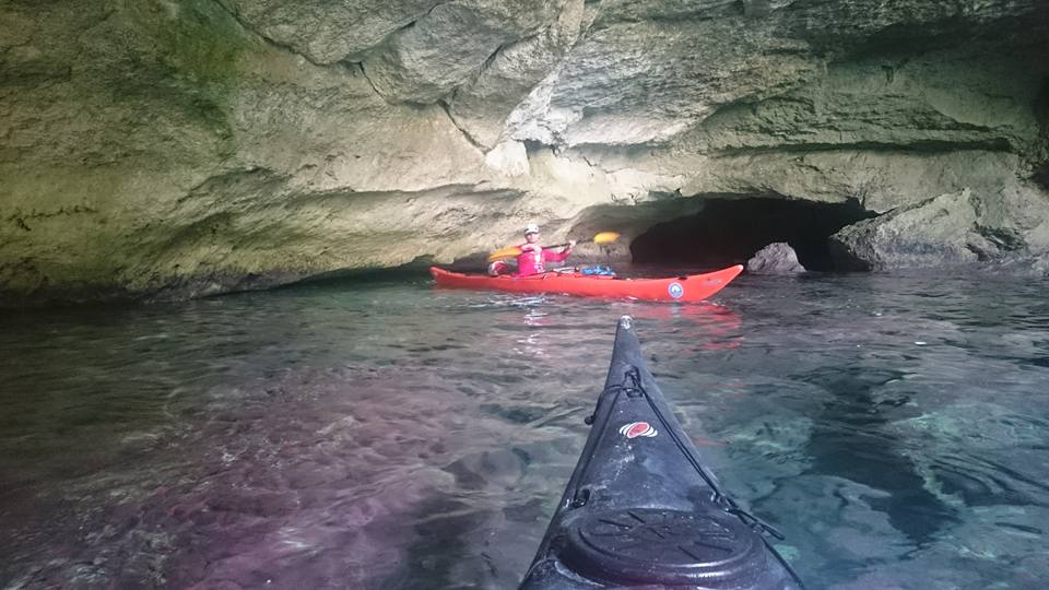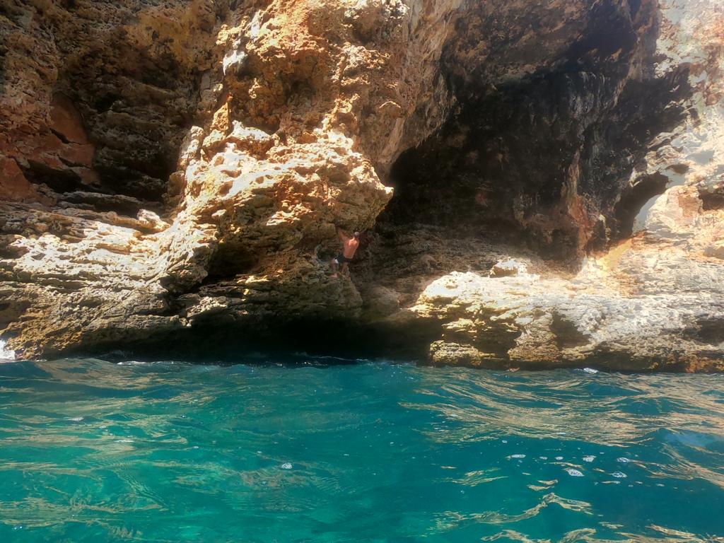 Los primeros kilómetros caen rápidamente, las fuerzas y las ganas están al 100%. Abandonamos el sur para entrar en la cara este de la isla, dejando a nuestra derecha el Faro de la isla del Aire. Siguiendo las indicaciones de nuestro mapa náutico, a pocos metros de pasar la urbanización s’Alga, entramos en la estrecha Cala Rafalet. Tras meter los kayaks como buenamente pudimos, aprovechamos para descansar y hacer un poco el mono en las paredes de sus acantilados.